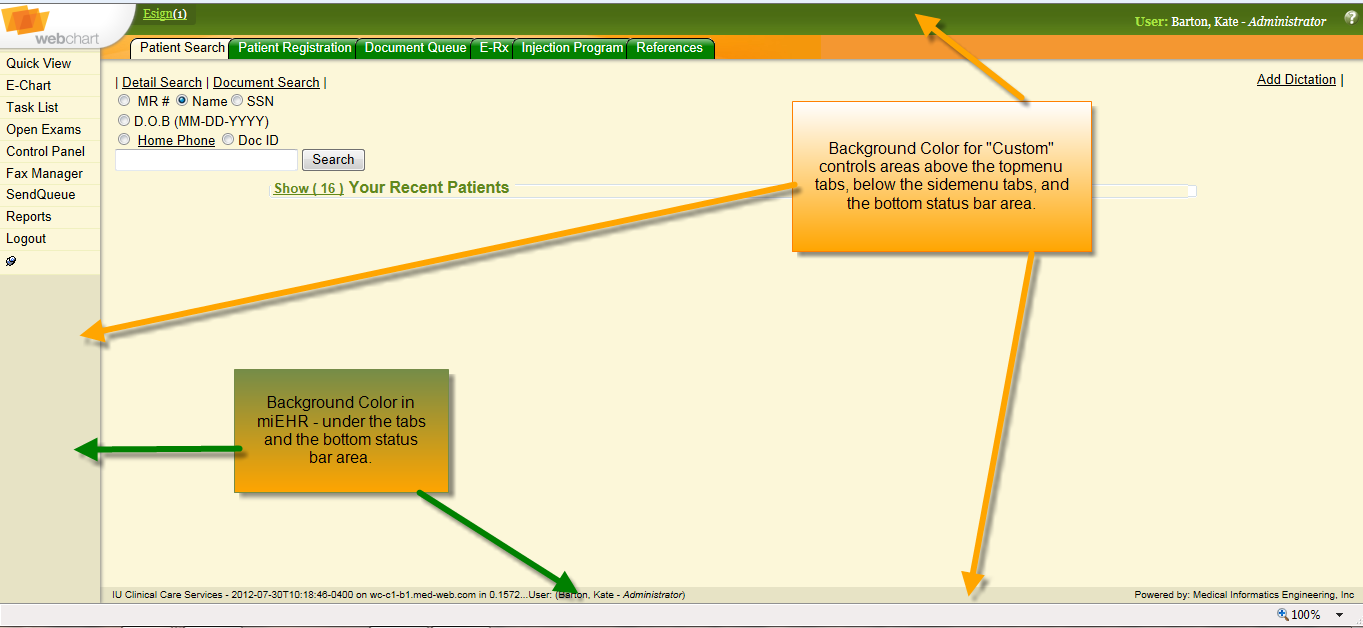 Background Color For "Custom", controls the outside frame – above tabs, below sidemenu, bottom status line of WC .For "miEHR", controls below the sidemenu tabs and the status bar at the bottom.